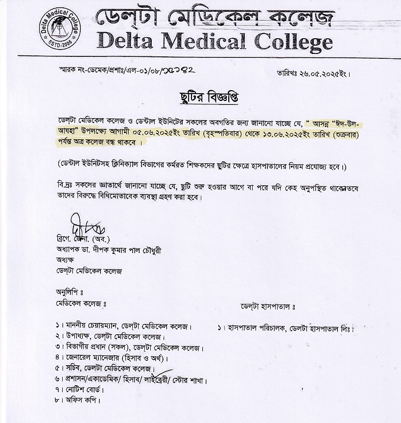 আসন্ন ”ঈদ উল- আযহা উপলক্ষে আগামী ০৫-০৬-২০২৫ ইং তারিখ থেকে ১৩-০৬-২০২৫ ইং তারিখ পর্যন্ত কলেজ, গ্রন্থাগার বন্ধ থাকবে ।